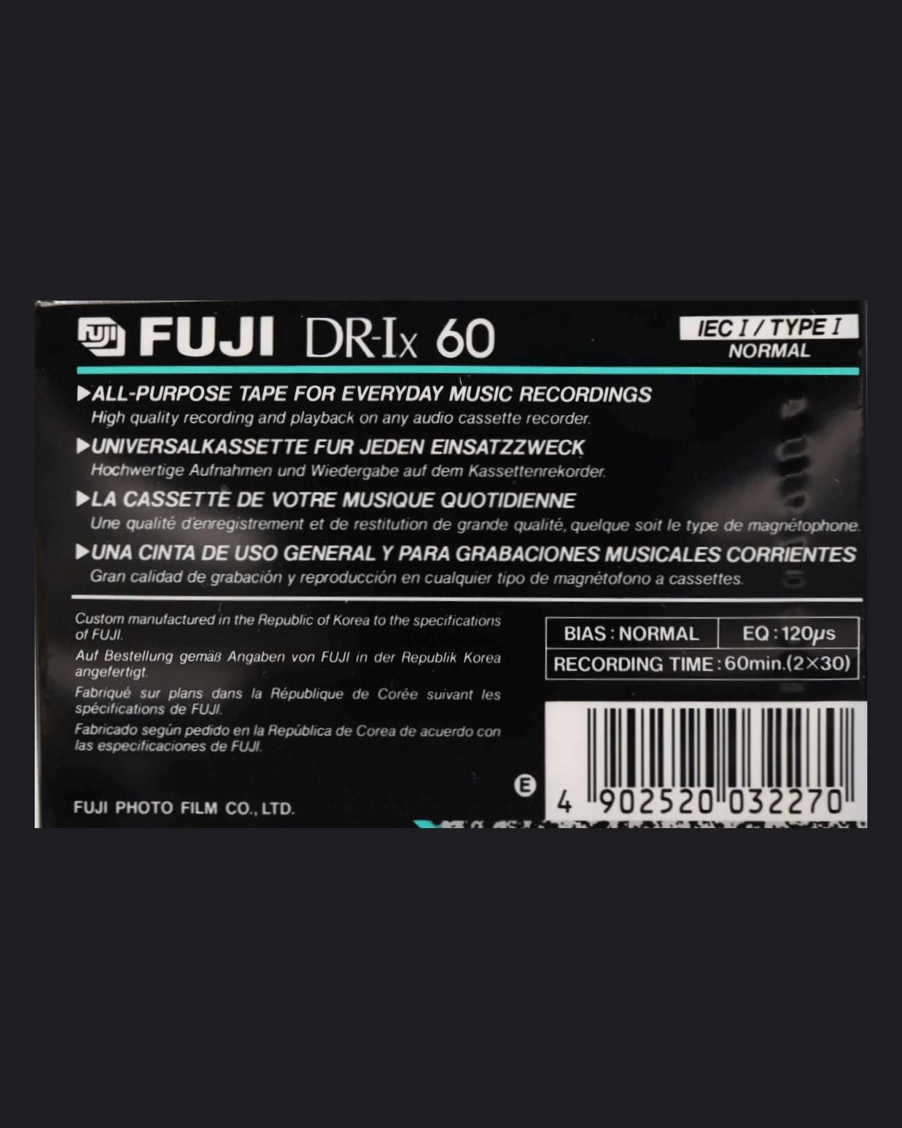 The Fuji DR-Ix (1990 EU) is a high-quality, blank audio cassette tape designed for professional and personal use. Manufactured in South Korea, this cassette tape is part of the renowned Fuji brand, known for its reliability and superior sound quality.